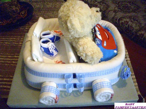 pampers luiers - 15 stuks, sokken - 1 paar, baby deken, jongens tricot t-shirt met een motief, knuffel voor de baby, sneakers, label - 2x, decoratief materiaal, linten